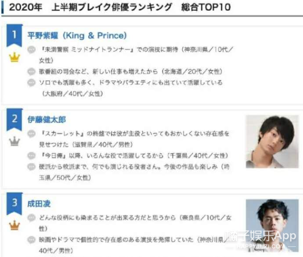 今年上半年日媒公布的2020爆红演员排行榜。他综合排名第二 ▽