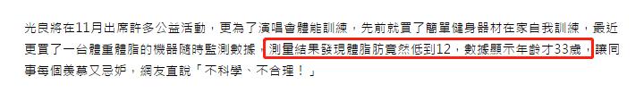 早前。有台媒报道称光良因为明年1月将举行演唱会。再加上11月需要出席众多公益活动。所以早早地就买了一些简单的健身器材在家训练。最近又购入了一台体脂检测器。令人感到意外的是。今年已经50岁的光良体脂率竟然只有12。身体年龄更是显示只有33岁。