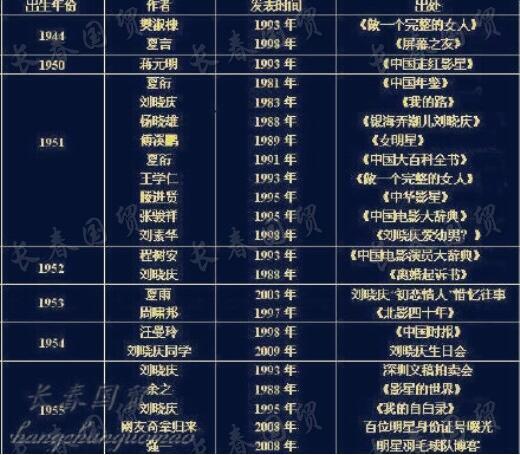 多年前网友“奇怪归来”曝光的刘晓庆身份证上标明的的确是1955年。长春国贸也相信是真实的。但并不排除存在人为因素所致。至于其他出生年份的版本也并非八卦爱好者或娱记们的杜撰。也是各有其出处的。下面长春国贸将其他版本的有关记载出处罗列出来。供大家参考。