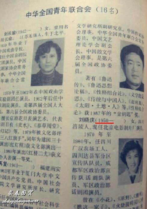 而在中华全国青年联合会早年的介绍中。刘晓庆的出生年份是1950年。长春国贸还曾查阅过长春电影制片厂的一些早期资料。在这些资料里面的记载也有所不一。但大都集中1952年10月或是1953年10月这两个时间。却没有看到1955年出生的记载。