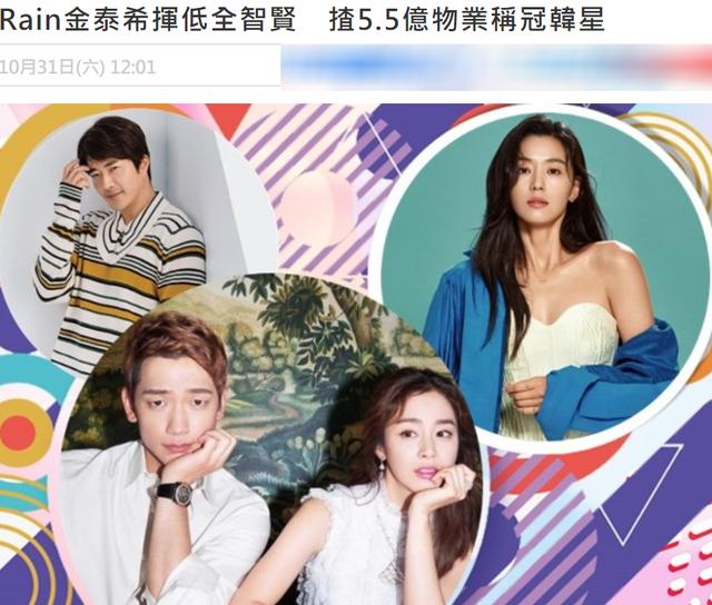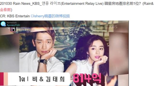 近日。有韩国节目公布了圈中拥有最高物业资产的明星排行榜。其中Rain与金泰熙这对小夫妻力压众星超过权相佑、全智贤登上榜首。二人名下的物业总和约814亿韩元稳居第一。(近五个亿人民