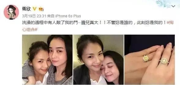 蒋欣还在微博上晒了同款戒指。配文:不管你是谁的。此刻你是我的。