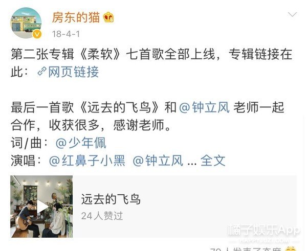 房东的猫的第一张同名专辑《房东的猫》众筹20多万。