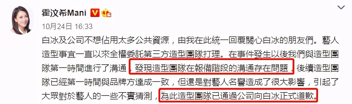 两天之后。白冰经纪公司负责人霍汶希正式回应此事。称是第三方造型团队在报备阶段出现了沟通问题。对方已正式道歉。艺人白冰无辜被牵连。