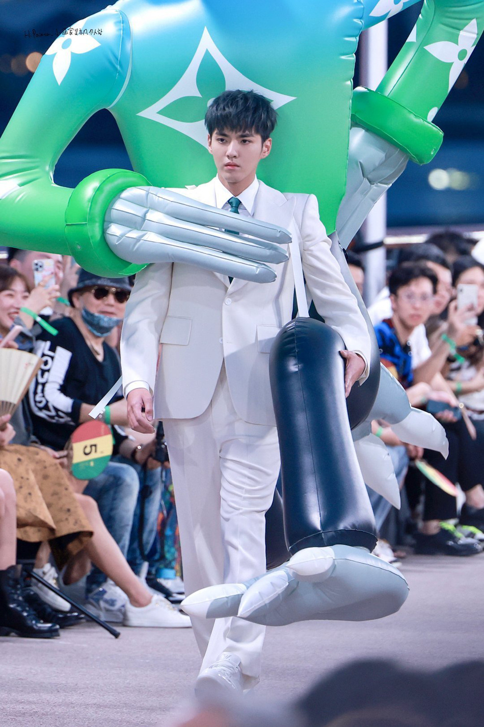 一脸严肃高冷范儿的凡凡背着两米高的充气玩偶出场。引发看秀嘉宾疯狂拍照。仿佛被充气玩偶绑架了一样。这反差萌令粉丝直呼可爱!